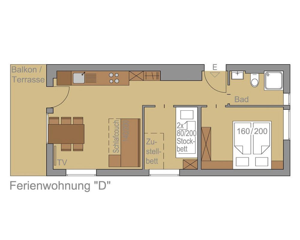 Das kleine Schlafzimmer verfügt über ein Stockbett (2x 80/200), auch hier können wir Ihnen noch ein Zustellbett aufstellen. Über eine interne Türe kann die Fewo D mit der Fewo C zusammengeschaltet werden und bietet sich somit ideal für Reisegruppen (z.B. Familie mit Großeltern) an.